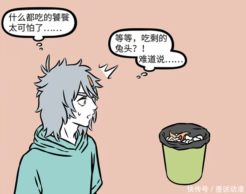 哮天发现饕餮什么东西都吃,这实在太可怕。养在公司感觉就是安全隐患,此时哮天发现有个兔头。不过为何会有个兔头丢在垃圾桶里?其实哮天好好想想,就知道是九月或者敖烈吃的普通兔头,以前他们在公司吃过,只是因为小玉本体是玉兔,所以他们在后来很少吃。