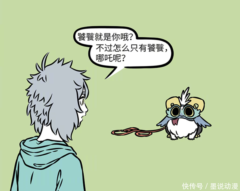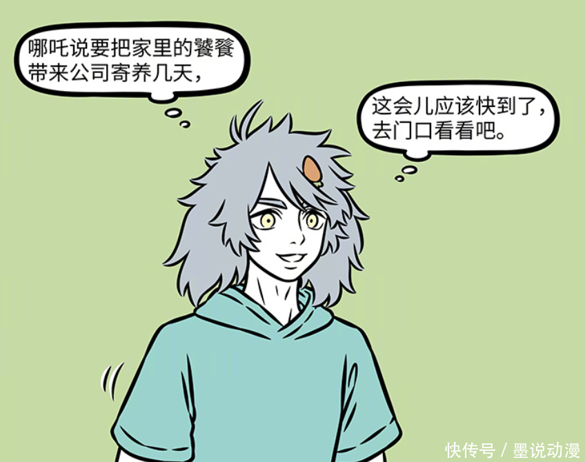 哪吒说要将家里养的饕餮带来公司养几天,哮天很感兴趣。按照之前的漫画来看,哮天应该没见过饕餮。按照哪吒说的时间,哮天觉得饕餮应该已经快要到了,所以他想去门口看看。至于饕餮,原本是《有兽焉》中的主要角色之一,平时什么都吃。